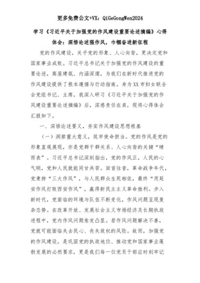 【七哥公文】2025年:学习《习近平关于加强党的作风建设重要论述摘编》心得体会:深悟论述强作风,巾帼奋进新征程+更多免费公文+VX:QiGeGongWen2024+更多免费公文+VX:QiGeGongWen2024