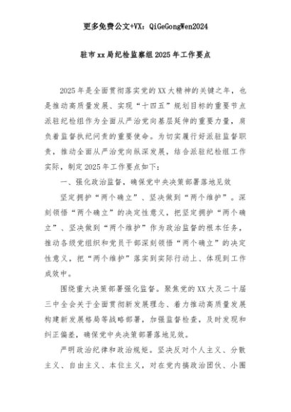 【七哥公文】2025年:驻市xx局纪检监察组2025年工作要点+更多免费公文+VX:QiGeGongWen2024+更多免费公文+VX:QiGeGongWen2024