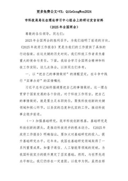 【七哥公文】2025年:市科技局局长在理论学习中心组会上的研讨发言材料(2025年全国两会)+更多免费公文+VX:QiGeGongWen2024+更多免费公文+VX:QiGeGongWen2024