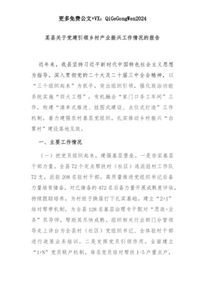【七哥公文】2025年:某县关于党建引领乡村产业振兴工作情况的报告+更多免费公文+VX:QiGeGongWen2024+更多免费公文+VX:QiGeGongWen2024