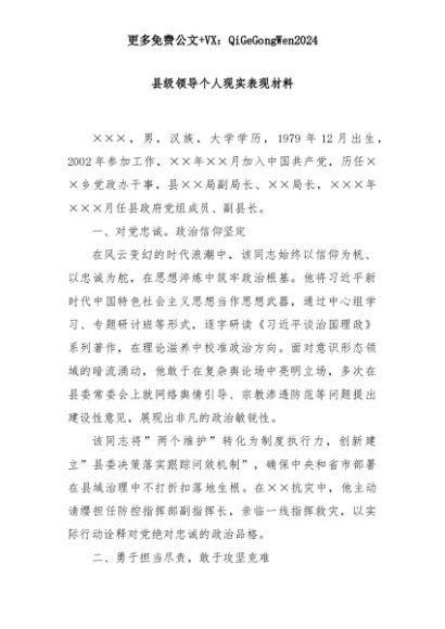 【七哥公文】2025年:县级领导个人现实表现材料+更多免费公文+VX:QiGeGongWen2024+更多免费公文+VX:QiGeGongWen2024