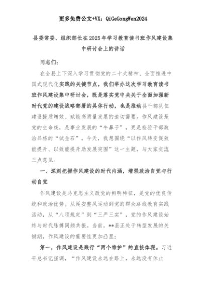 【七哥公文】2025年:县委常委、组织部长在2025年学习教育读书班作风建设集中研讨会上的讲话+更多免费公文+VX:QiGeGongWen2024+更多免费公文+VX:QiGeGongWen2024