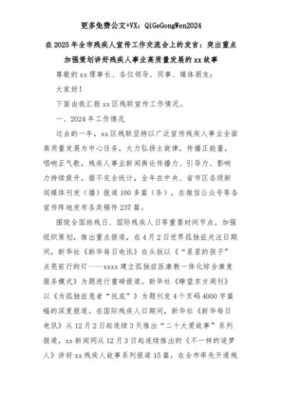【七哥公文】2025年:在2025年全市残疾人宣传工作交流会上的发言:突出重点加强策划讲好残疾人事业高质量发展的xx故事+更多免费公文+VX:QiGeGongWen2024+更多免费公文+VX:QiGeGongWen2024