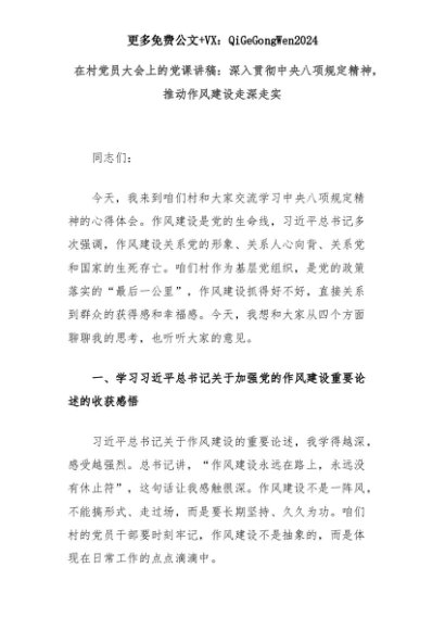【七哥公文】2025年:在村党员大会上的党课讲稿:深入贯彻中央八项规定精神,推动作风建设走深走实+更多免费公文+VX:QiGeGongWen2024+更多免费公文+VX:QiGeGongWen2024