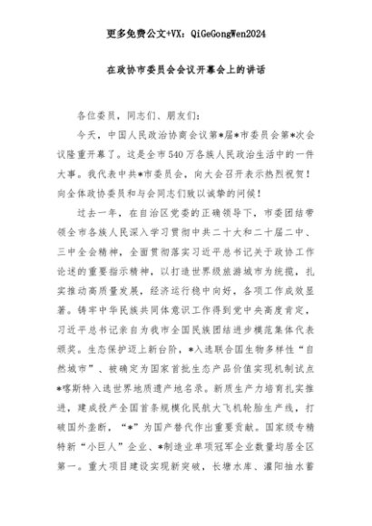 【七哥公文】2025年:在政协市委员会会议开幕会上的讲话+更多免费公文+VX:QiGeGongWen2024+更多免费公文+VX:QiGeGongWen2024