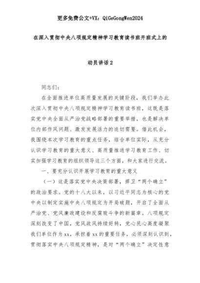 【七哥公文】2025年:在深入贯彻中央八项规定精神学习教育读书班开班式上的动员讲话2+更多免费公文+VX:QiGeGongWen2024+更多免费公文+VX:QiGeGongWen2024