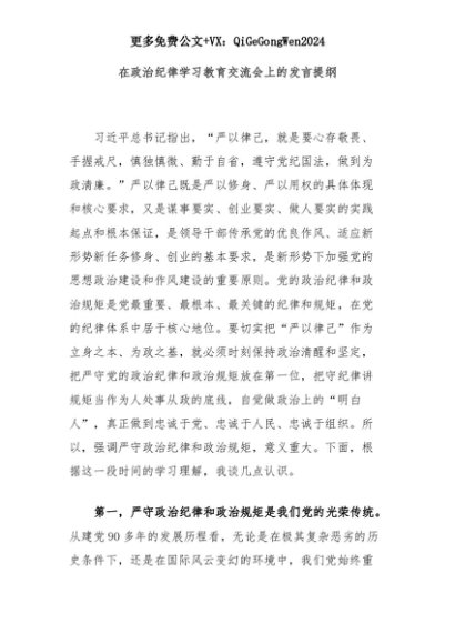 【七哥公文】2025年:在政治纪律学习教育交流会上的发言提纲+更多免费公文+VX:QiGeGongWen2024+更多免费公文+VX:QiGeGongWen2024