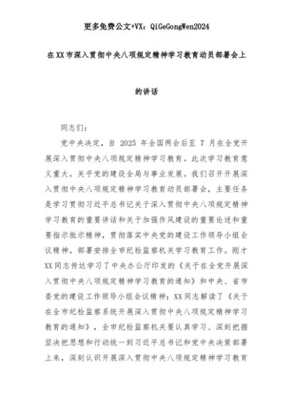 【七哥公文】2025年:在XX市深入贯彻中央八项规定精神学习教育动员部署会上的讲话+更多免费公文+VX:QiGeGongWen2024+更多免费公文+VX:QiGeGongWen2024
