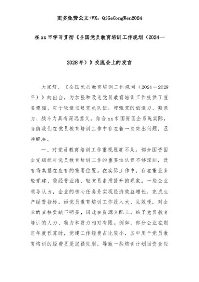 【七哥公文】2025年:在xx市学习贯彻《全国党员教育培训工作规划(2024—2028年)》交流会上的发言+更多免费公文+VX:QiGeGongWen2024+更多免费公文+VX:QiGeGongWen2024