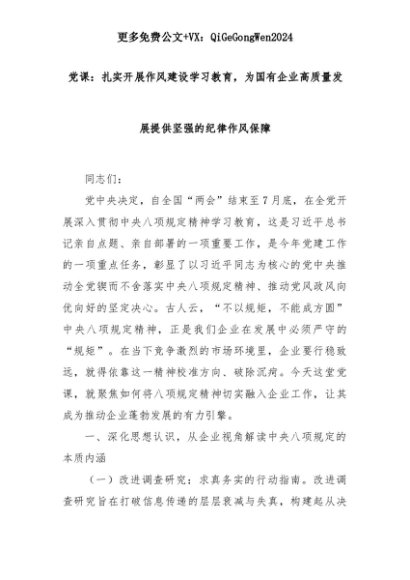 【七哥公文】2025年:党课:扎实开展作风建设学习教育,为国有企业高质量发展提供坚强的纪律作风保障+更多免费公文+VX:QiGeGongWen2024+更多免费公文+VX:QiGeGongWen2024