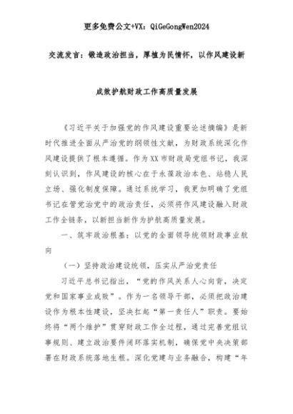【七哥公文】2025年:交流发言:锻造政治担当,厚植为民情怀,以作风建设新成效护航财政工作高质量发展+更多免费公文+VX:QiGeGongWen2024+更多免费公文+VX:QiGeGongWen2024