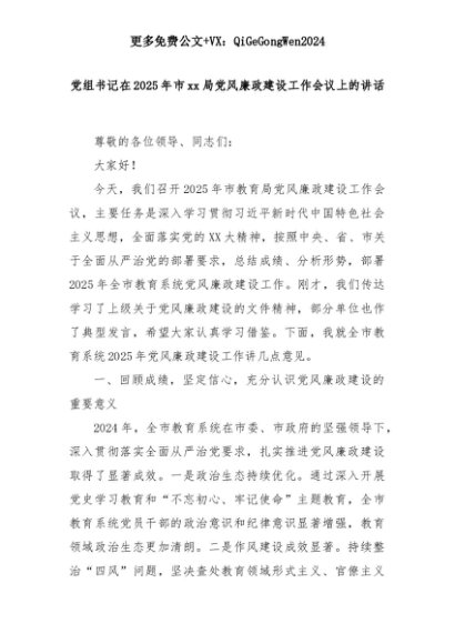 【七哥公文】2025年:党组书记在2025年市xx局党风廉政建设工作会议上的讲话+更多免费公文+VX:QiGeGongWen2024+更多免费公文+VX:QiGeGongWen2024