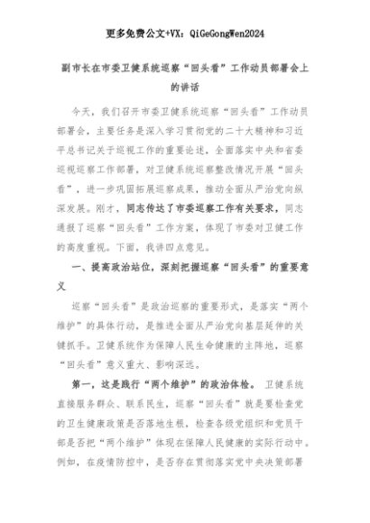 【七哥公文】2025年:副市长在市委卫健系统巡察“回头看”工作动员部署会上的讲话+更多免费公文+VX:QiGeGongWen2024+更多免费公文+VX:QiGeGongWen2024