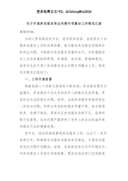 【七哥公文】2025年:关于开展养老服务突出问题专项整治工作情况汇报+更多免费公文+VX:QiGeGongWen2024+更多免费公文+VX:QiGeGongWen2024