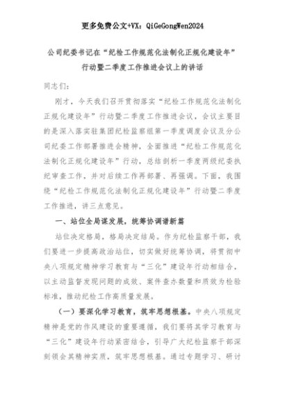 【七哥公文】2025年:公司纪委书记在“纪检工作规范化法制化正规化建设年”行动暨二季度工作推进会议上的讲话+更多免费公文+VX:QiGeGongWen2024+更多免费公文+VX:QiGeGongWen2024