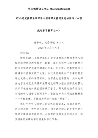 【七哥公文】2025年:XX公司党委理论学习中心组学习主持词及总结讲话(八项规定学习教育之一)+更多免费公文+VX:QiGeGongWen2024+更多免费公文+VX:QiGeGongWen2024