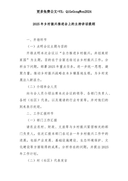 【七哥公文】2025年:2025年乡村振兴推进会上的主持讲话提纲+更多免费公文+VX:QiGeGongWen2024+更多免费公文+VX:QiGeGongWen2024
