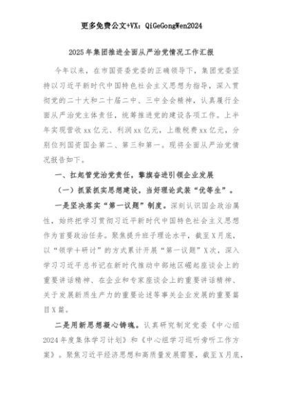 【七哥公文】2025年:2025年集团推进全面从严治党情况工作汇报+更多免费公文+VX:QiGeGongWen2024+更多免费公文+VX:QiGeGongWen2024