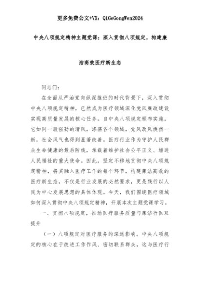 【七哥公文】2025年:中央八项规定精神主题党课:深入贯彻八项规定,构建廉洁高效医疗新生态+更多免费公文+VX:QiGeGongWen2024+更多免费公文+VX:QiGeGongWen2024