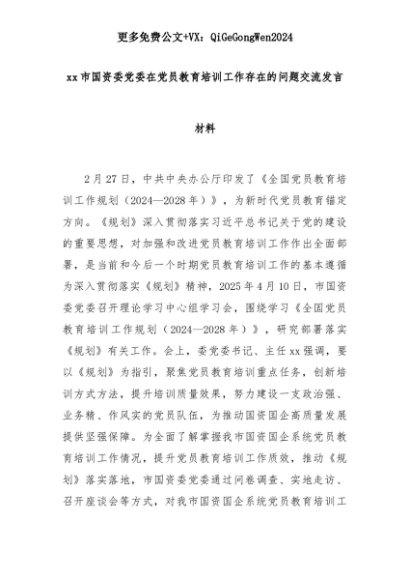 【七哥公文】2025年:xx市国资委党委在党员教育培训工作存在的问题交流发言材料+更多免费公文+VX:QiGeGongWen2024+更多免费公文+VX:QiGeGongWen2024