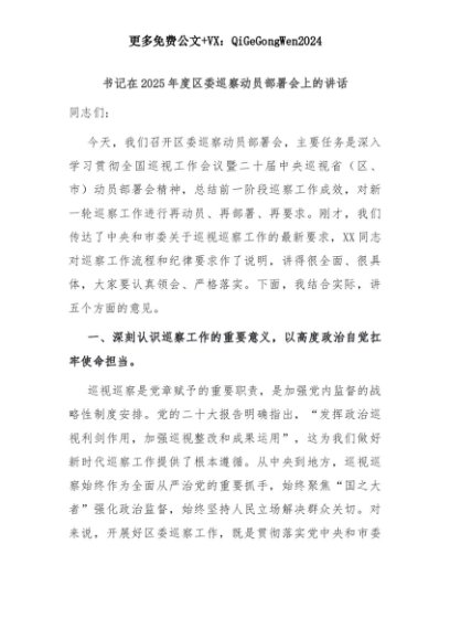 【七哥公文】2025年:书记在2025年度区委巡察动员部署会上的讲话+更多免费公文+VX:QiGeGongWen2024+更多免费公文+VX:QiGeGongWen2024