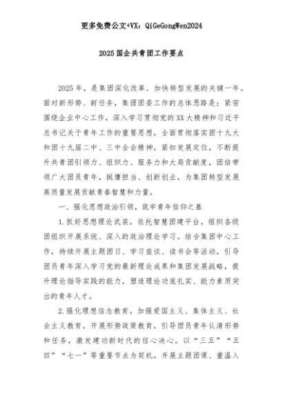 【七哥公文】2025年:2025国企共青团工作要点+更多免费公文+VX:QiGeGongWen2024+更多免费公文+VX:QiGeGongWen2024