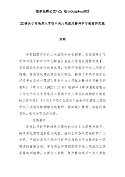 【七哥公文】2025年:XX镇关于开展深入贯彻中央八项规定精神学习教育的实施方案+更多免费公文+VX:QiGeGongWen2024+更多免费公文+VX:QiGeGongWen2024
