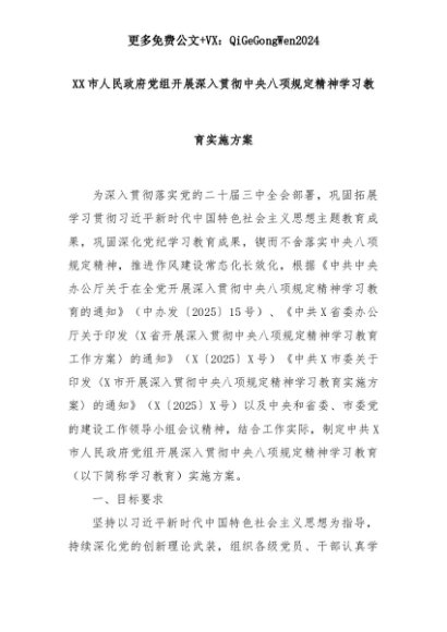 【七哥公文】2025年:XX市人民政府党组开展深入贯彻中央八项规定精神学习教育实施方案+更多免费公文+VX:QiGeGongWen2024+更多免费公文+VX:QiGeGongWen2024