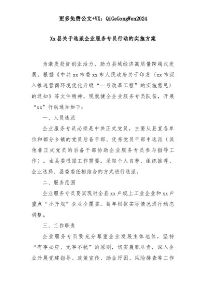 【七哥公文】2025年:Xx县关于选派企业服务专员行动的实施方案+更多免费公文+VX:QiGeGongWen2024+更多免费公文+VX:QiGeGongWen2024