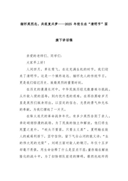 【七哥公文】2025年:缅怀英烈志,共筑复兴梦——2025 年校长在“清明节”国旗下讲话稿+更多免费公文+VX:QiGeGongWen2024