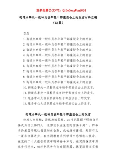 【七哥公文】2025年:(13篇)街道办事处一级科员在年轻干部座谈会上的发言材料汇编+更多免费公文+VX:QiGeGongWen2024+更多免费公文+VX:QiGeGongWen2024