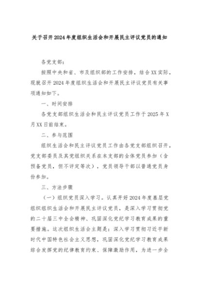 【七哥公文】2025年:关于召开2024年度组织生活会和开展民主评议党员的通知+更多免费公文+VX:QiGeGongWen2024