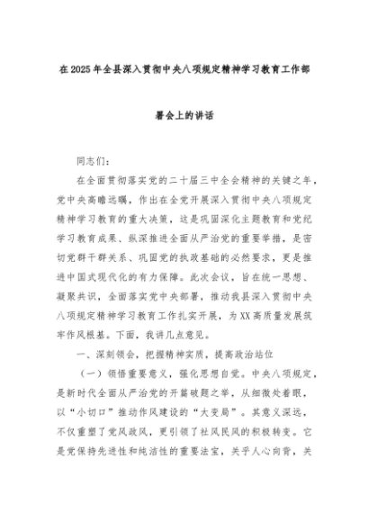 【七哥公文】2025年:在2025年全县深入贯彻中央八项规定精神学习教育工作部署会上的讲话+更多免费公文+VX:QiGeGongWen2024
