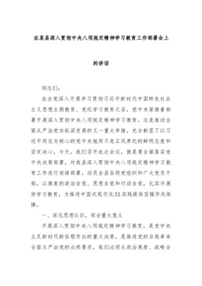 【七哥公文】2025年:在某县深入贯彻中央八项规定精神学习教育工作部署会上的讲话+更多免费公文+VX:QiGeGongWen2024
