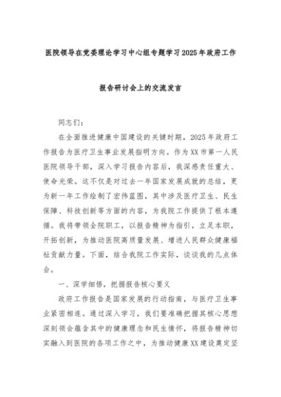 【七哥公文】2025年:医院领导在党委理论学习中心组专题学习2025年政府工作报告研讨会上的交流发言+更多免费公文+VX:QiGeGongWen2024