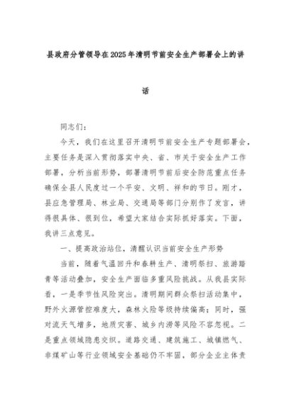 【七哥公文】2025年:县政府分管领导在2025年清明节前安全生产部署会上的讲话+更多免费公文+VX:QiGeGongWen2024
