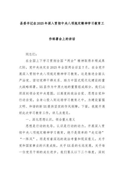 【七哥公文】2025年:县委书记在2025年深入贯彻中央八项规定精神学习教育工作部署会上的讲话+更多免费公文+VX:QiGeGongWen2024