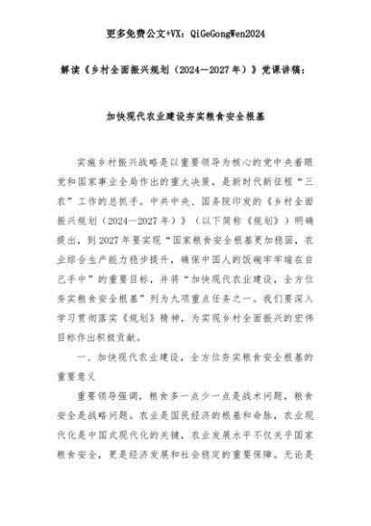 【七哥公文】2025年:解读《乡村全面振兴规划(2024-2027年)》党课讲稿:加快现代农业建设夯实粮食安全根基+更多免费公文+VX:QiGeGongWen2024+更多免费公文+VX:QiGeGongWen2024