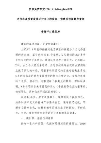 【七哥公文】2025年:老师在高质量发展研讨会上的发言:党建引领凝聚力量师者情怀打造品牌+更多免费公文+VX:QiGeGongWen2024+更多免费公文+VX:QiGeGongWen2024
