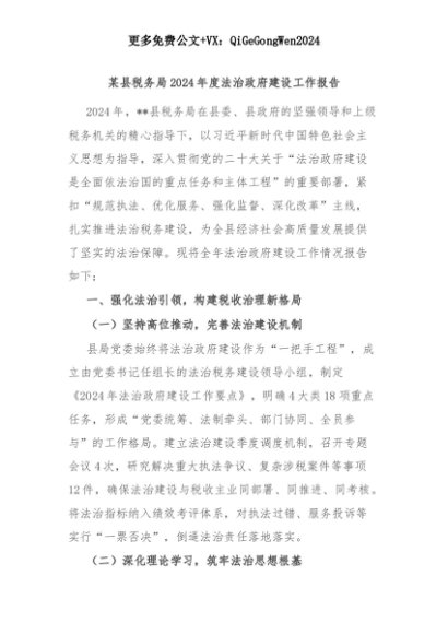 【七哥公文】2025年:某县税务局2024年度法治政府建设工作报告+更多免费公文+VX:QiGeGongWen2024+更多免费公文+VX:QiGeGongWen2024