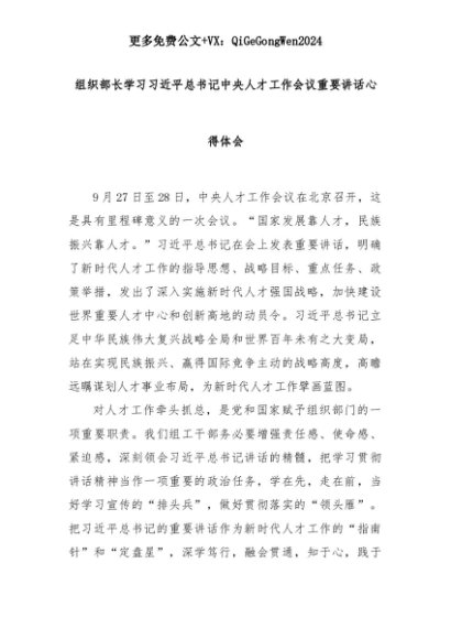 【七哥公文】2025年:组织部长学习习近平总书记中央人才工作会议重要讲话心得体会+更多免费公文+VX:QiGeGongWen2024+更多免费公文+VX:QiGeGongWen2024