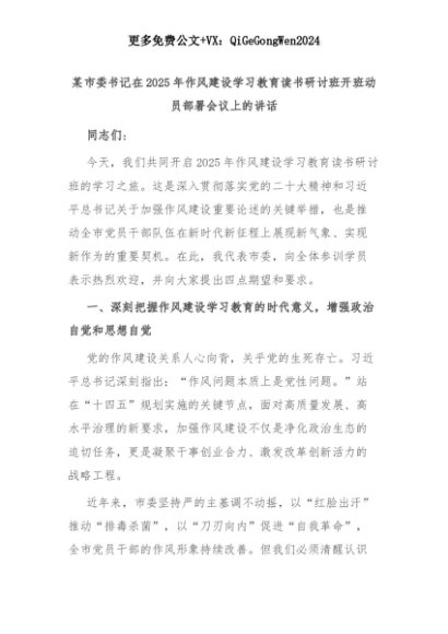 【七哥公文】2025年:某市委书记在2025年作风建设学习教育读书研讨班开班动员部署会议上的讲话+更多免费公文+VX:QiGeGongWen2024+更多免费公文+VX:QiGeGongWen2024