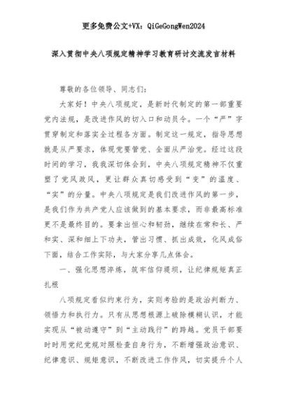 【七哥公文】2025年:深入贯彻中央八项规定精神学习教育研讨交流发言材料+更多免费公文+VX:QiGeGongWen2024+更多免费公文+VX:QiGeGongWen2024