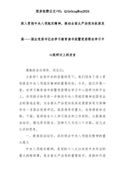 【七哥公文】2025年:深入贯彻中央八项规定精神,推动全面从严治党向纵深发展——国企党委书记在学习教育读书班暨党委理论学习中心组研讨上的发言+更多免费公文+VX:QiGeGongWen2024+更多免费公文+VX:QiGeGongWen2024