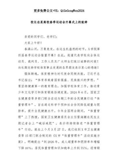 【七哥公文】2025年:校长在某高校春季运动会开幕式上的致辞+更多免费公文+VX:QiGeGongWen2024+更多免费公文+VX:QiGeGongWen2024