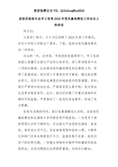 【七哥公文】2025年:派驻纪检组长在市工信局2025年党风廉政建设工作会议上的讲话+更多免费公文+VX:QiGeGongWen2024+更多免费公文+VX:QiGeGongWen2024