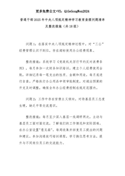 【七哥公文】2025年:普通干部2025年中央八项规定精神学习教育查摆问题清单及整改措施(共18组)+更多免费公文+VX:QiGeGongWen2024+更多免费公文+VX:QiGeGongWen2024