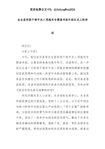 【七哥公文】2025年:在全县科级干部中央八项规定专题读书班开班仪式上的讲话+更多免费公文+VX:QiGeGongWen2024+更多免费公文+VX:QiGeGongWen2024