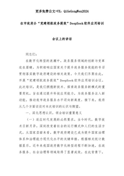 【七哥公文】2025年:在市政府办“党建领航政务提效”DeepSeek软件应用培训会议上的讲话+更多免费公文+VX:QiGeGongWen2024+更多免费公文+VX:QiGeGongWen2024