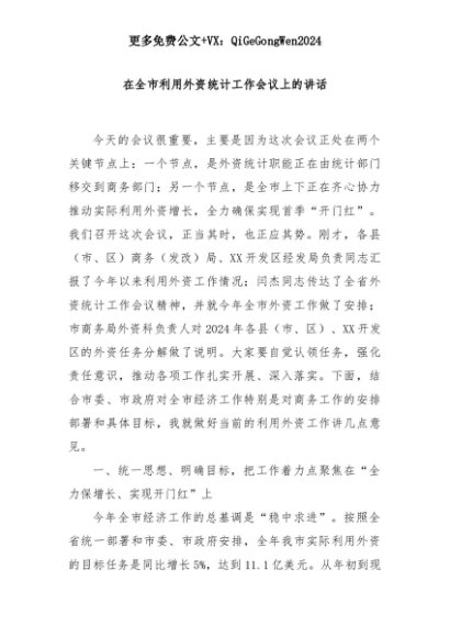 【七哥公文】2025年:在全市利用外资统计工作会议上的讲话+更多免费公文+VX:QiGeGongWen2024+更多免费公文+VX:QiGeGongWen2024